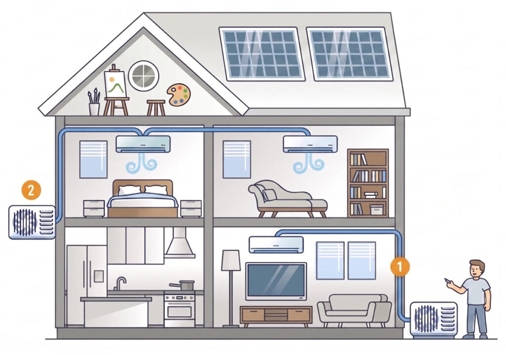 Dit werkt volgens hetzelfde principe als de single split airco, maar dan met meerdere binnenunits die zijn aangesloten op één buitenunit. Ideaal als je meerdere ruimtes tegelijk wilt koelen of verwarmen met één systeem.